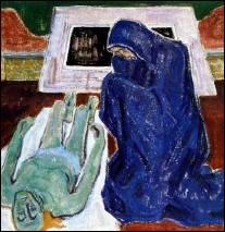 Nun geht es, wie gesagt, in der Malerei gar nicht darum, eine naturgetreue naturschöne Maria zu malen, sondern Marias Liebe und die kommt am besten zum Ausdruck, wenn von der detaillierten, bestimmten, festen Form abstrahiert wird, wenn die Figürlichkeit durchlässig, weich und unbestimmt wird, und die Farbe der Liebe oder Trauer bildbestimmend wird, wie sie es in den folgenden Marienbildern sehen.