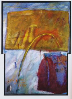 Darüber hinaus scheint sich der Künstler der Problematik eines total objektlosen Spiels des Scheinens bewusst gewesen zu sein, denn in allen Bildern gibt er uns Haltpunkte in der Tradition der alten Malerei, - geometrische Figuren, flüchtig und unscharf oder symbolisch. Wenn wir mit der christlichen Tradition vertraut sind, können wir uns orientieren und erhalten eine ungefähre Antwort auf die Frage: „Was ist das?" Eine lange Suche erübrigt sich. Die Bilder haben alle Kreuzesform. Wir entdecken rinnende Farben wie Bäche von Tränen, die als Äußerung des Schmerzes oder der Trauer aufgefasst werden können, wir schauen Gold und Silber als Farben des Vaters und des Sohnes, und alle Bilder haben den Inhalt, um den es in ihnen geht, als Wort mit aufgenommen. Die Hereinnahme des Wortes, der Verzicht auf einen außen angehefteten wie auch immer gearteten Titel, verbindet die Kunst des Malens mit der der Sprache. Sonst aber finden wir in den „Sieben Kreuzen zu den letzten Worten" keine Figuren, keine festen äußerlichen Hüllen, sondern lebendige Farben, die in sich und untereinander reflektiert sind und sich aufeinander beziehen. Wir schauen das innere Geschehen der Kreuzigung nicht nur an, sondern erleben es mit, wenn wir unser Sehen gleichsam zu etwas Sukzessivem machen. Wenn wir keine Äußerung in ruhenden festen Gestaltungen erwarten, werden wir nicht enttäuscht, dann können wir den Formen und Farben zuschauen als Auslegung von Farben, als Logos und wir können den Farben wie den Tönen eines Musikwerkes folgen.