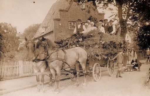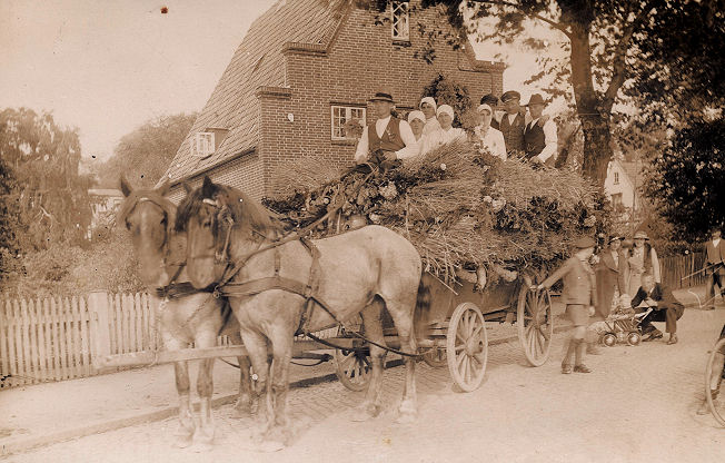 Der Dorfteich und der Leichenwagen Früher hatte Hüsby einen wirklichen Mittelpunkt. Unten im Dorf gab es alles. Die Meierei war nur das eine. Gleich daneben stand die Dorfschule, eine zweiklassige Volksschule, „de lütte“ und „de grote Skol“, mit zwei Lehrern, dem „kleinen“ Lehrer für die Jüngeren, dem „großen“ Lehrer für die oberen Jahrgänge. Hier kamen die Kinder täglich zusammen. Gegenüber der Schule hatte der eine von drei Kaufleuten des Dorfes sein Geschäft. Nicht zu vergessen der Bäcker. Der Dorfkrug war auch nicht weit. Mitten drin befand sich der Dorfteich. Da war auch immer Leben, denn hier reinigten die Bauern regelmäßig ihre Leiterwagen, die Räder, die Seitenbretter und andere Geräte von Dreck und Schmiere. Das gab immer so ein Hallo. Und im Sommer, wenn die großen Bretter der Wagen im Wasser schwammen und der Dreck aufweichte, hatten auch die Kinder ihren besonderen Spaß. Sie kletterten auf die Bretter und versuchten mit ihnen durch das Wasser zu reiten. Ich weiß nicht, wie man das heute nennen würde. Jedenfalls war es ein Mordsspaß und wenn ein Kind ins Wasser plumpste, lachten alle, selbst das Kind, das ins Wasser gefallen war. „Pütscherig“ war da keiner.